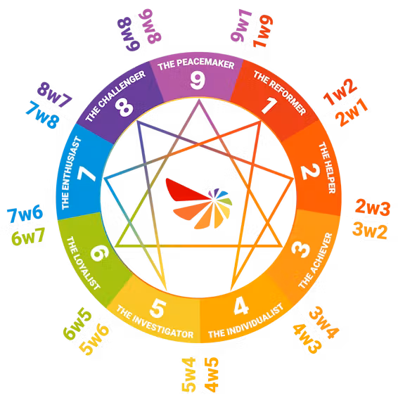 Enneagram wings add nuance and depth to the nine personality types within the Enneagram framework. Think of wings as neighboring influences that color and shape the primary characteristics of your core Enneagram type. As depicted in the illustration, each of the nine types has two adjacent wings. For instance, a Type 1 can have a wing 9 (1w9) or a wing 2 (1w2). Understanding these wings allows for a deeper exploration into the complexities of one's personality, helping to uncover the subtle nuances of behaviors, underlying motivations and Pi9 Purpose Intelligence.