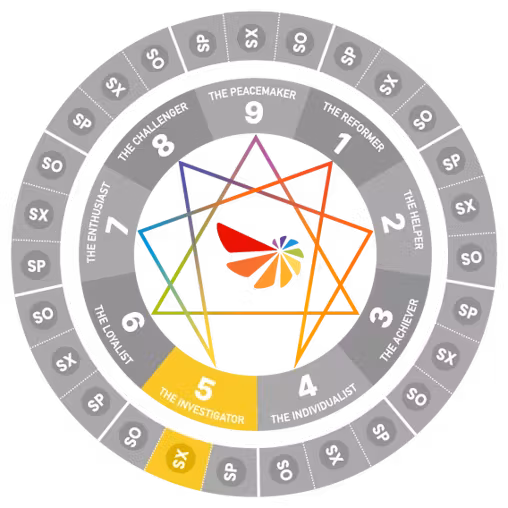 Access your full Enneagram Matrix of possibilities - a rich tapestry of all nine types including wings, lines of development, Subtype resources and more - to craft new responses aligned with authentic living. Sexual Five (SX5)s learn to channel their natural curiosity into genuine connection while maintaining their love of learning and sharing.
