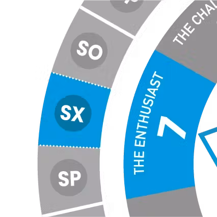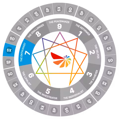 Access your full Enneagram Matrix of possibilities - a rich tapestry of all nine types including wings, lines of development, Subtype resources and more - to craft new responses aligned with authentic living. Sexual Seven (SX7)s learn to channel their natural enthusiasm into sustainable connection while maintaining their capacity for genuine joy.
