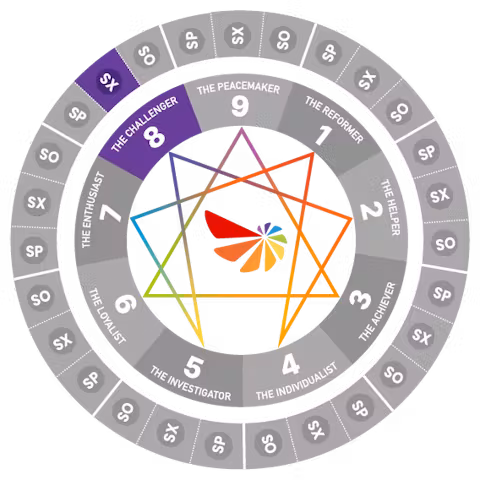Access your full Enneagram Matrix of possibilities - a rich tapestry of all nine types including wings, lines of development, Subtype resources and more - to craft new responses aligned with authentic living. Sexual Eight (SX8)s learn to channel their natural intensity into deep connection while maintaining their capacity for passionate care.
